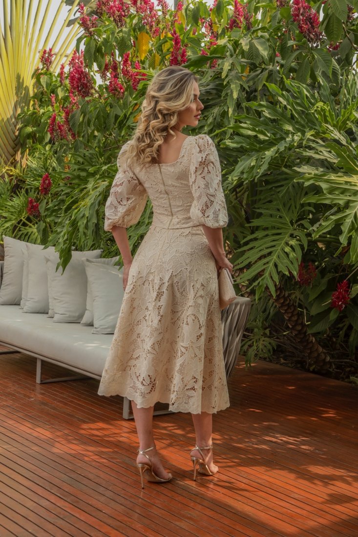 A blusa possui decote reto, mangas amplas bufantes e recorte ajustado abaixo do busto, valorizando a silhueta. A saia longa segue em laise trabalhada, com acabamento refinado que traz movimento e fluidez e fechamento com zíper nas costas;