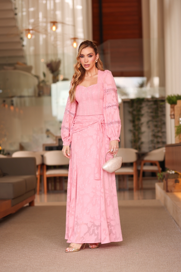 - Desenvolvido em crepe com detalhes em guippir, o modelo combina blusa e saia longa em uma proposta única e refinada;