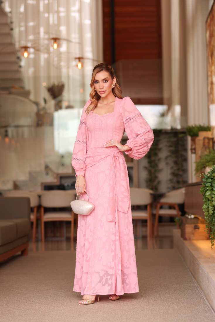 Vestido Midi Rosa Crepe Renda e Guippir