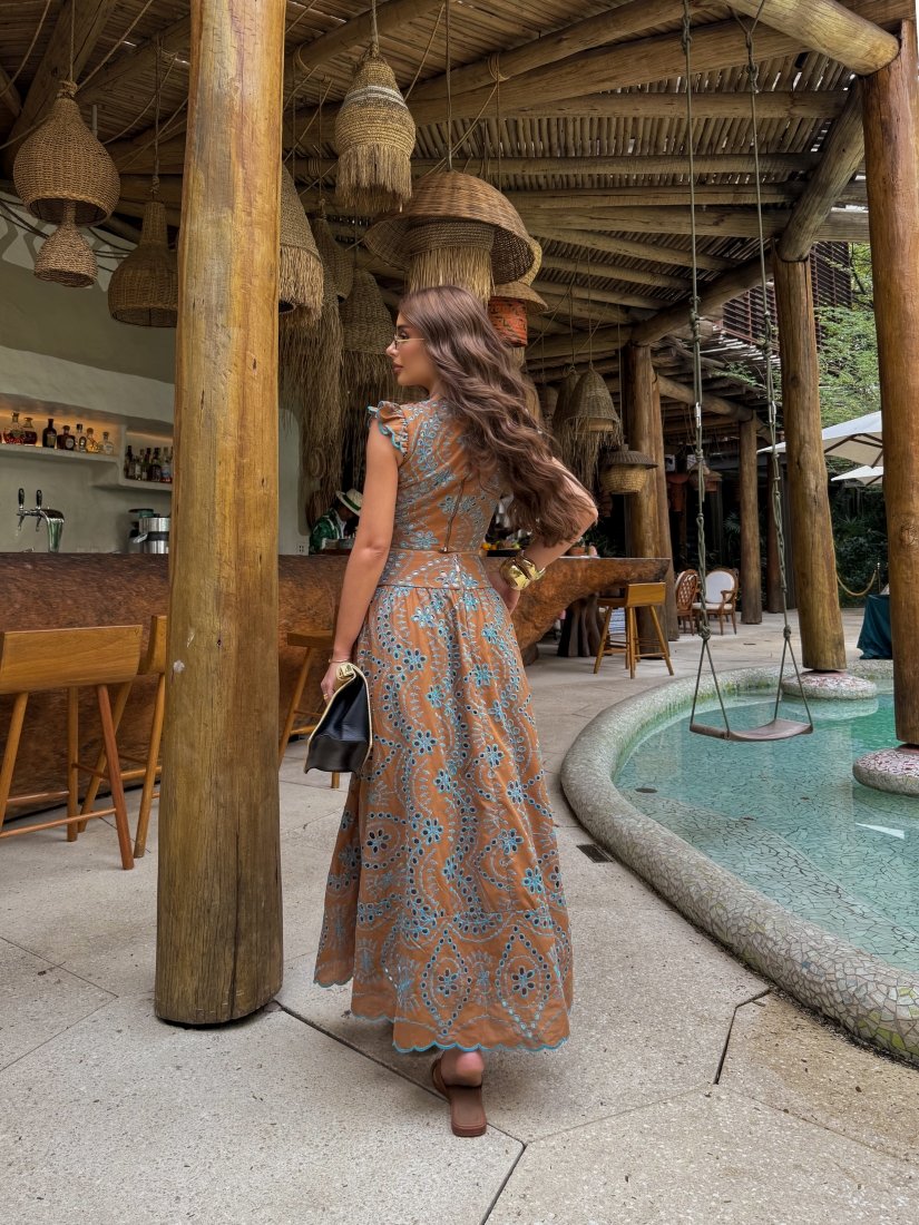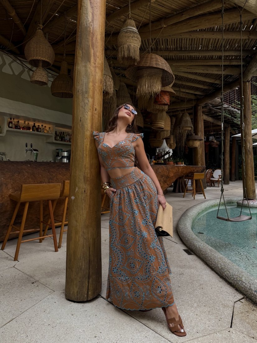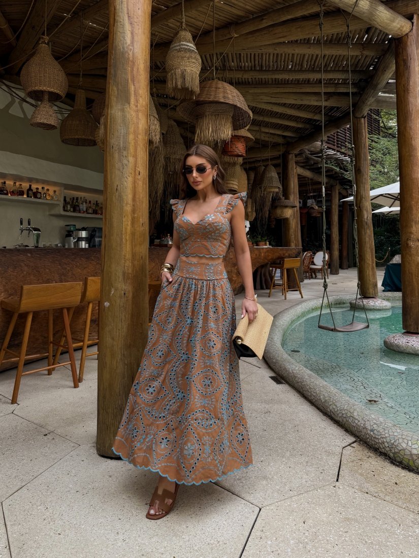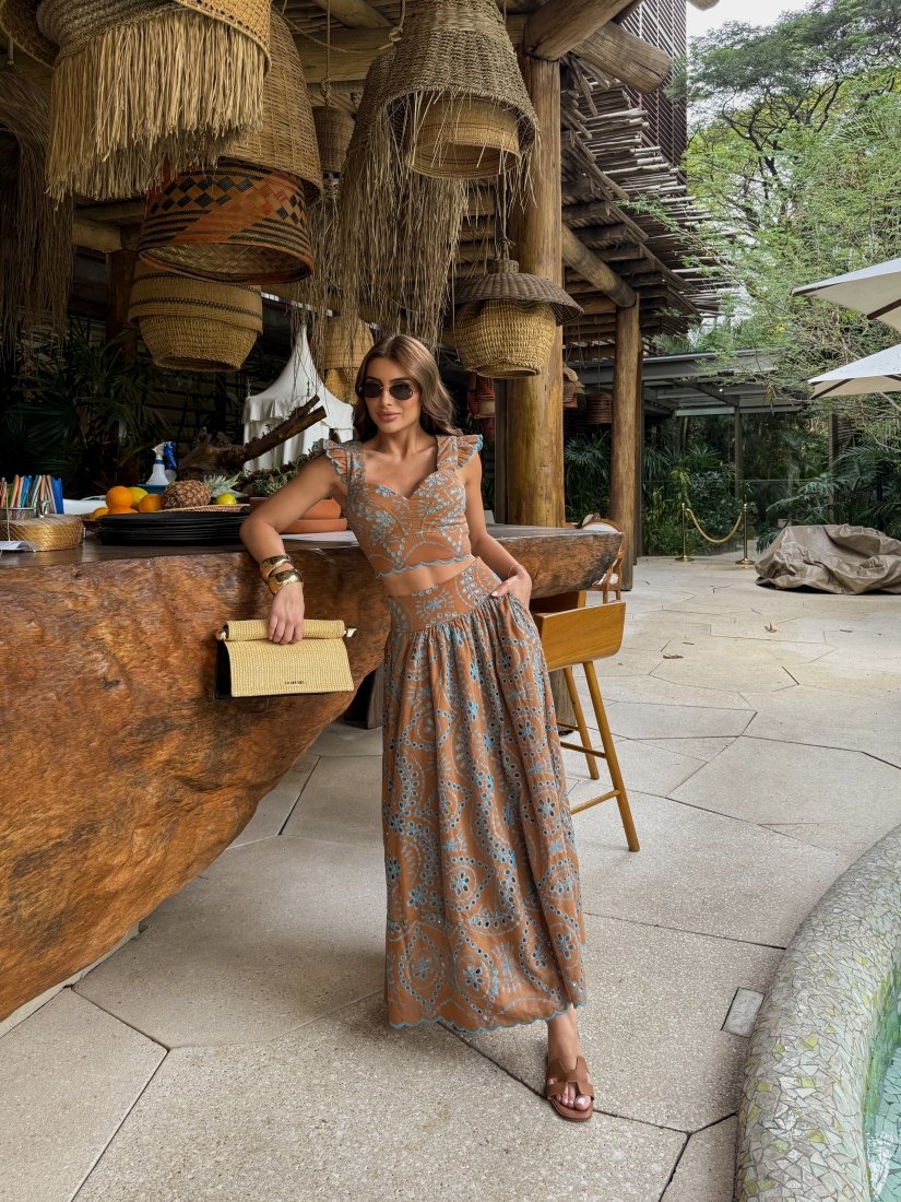 Confeccionado em laise de algodão, é perfeito para almoços tropicais, viagens litorâneas e ocasiões que pedem estilo leve e marcante;