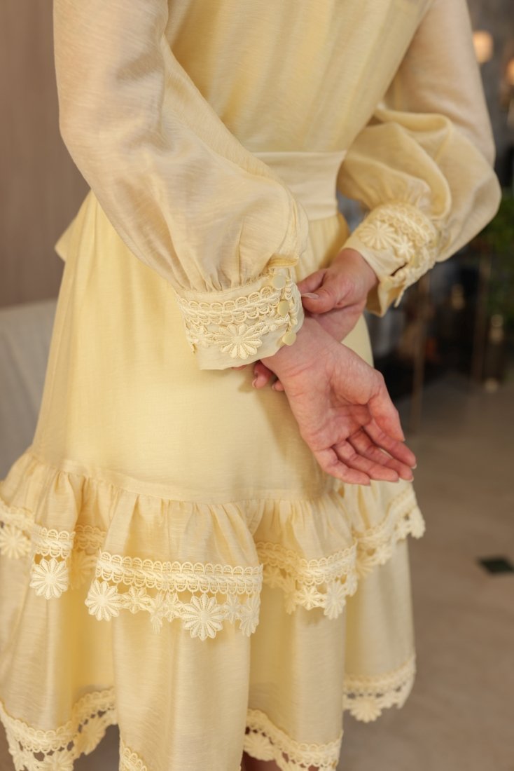- Os detalhes em guippir são aplicados de forma estratégica, criando contraste com a transparência da organza e valorizando o design com elegância;