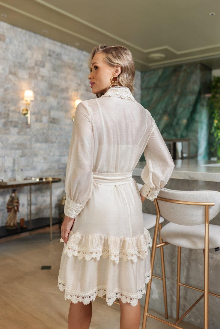 - Dicas Doce Maria: Use com sandálias de salto médio ou fino para valorizar a leveza do vestido. Para uma proposta mais delicada, aposte em acessórios sutis e tons neutros. Em ocasiões noturnas, combine com bolsa estruturada e pontos de luz para destacar os detalhes em guippir.