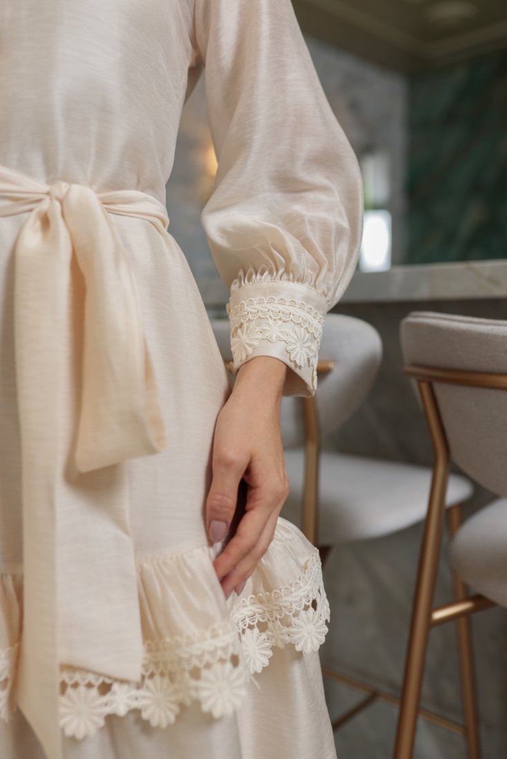 - O guippir aparece como ponto de destaque, enriquecendo a peça com textura e um acabamento refinado;