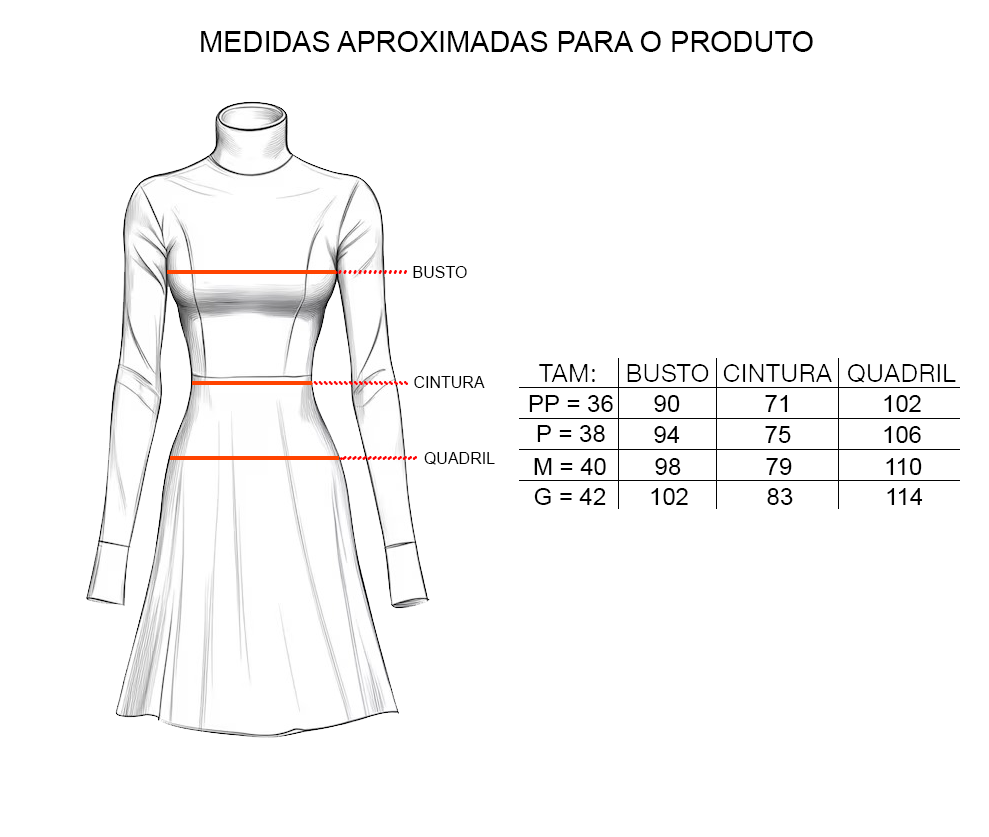 | Tamanho do Produto | PP (36), P (38), M (40), G (42) |