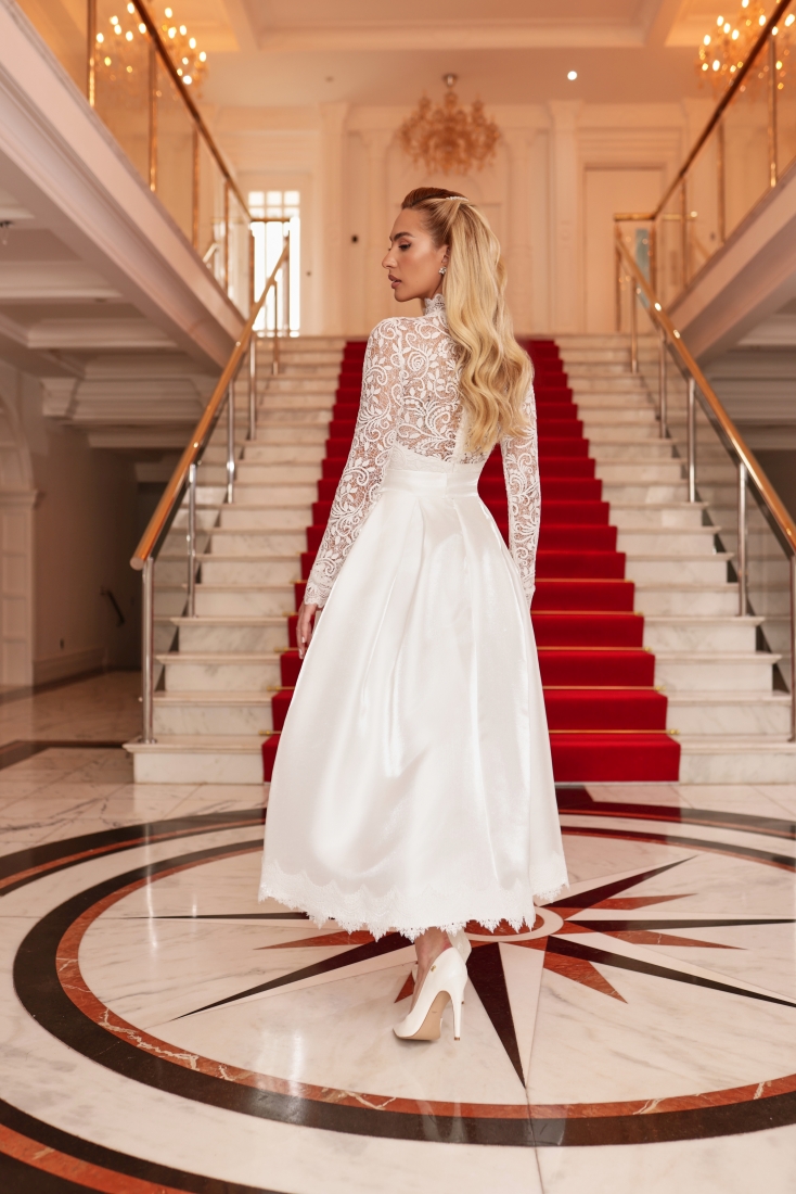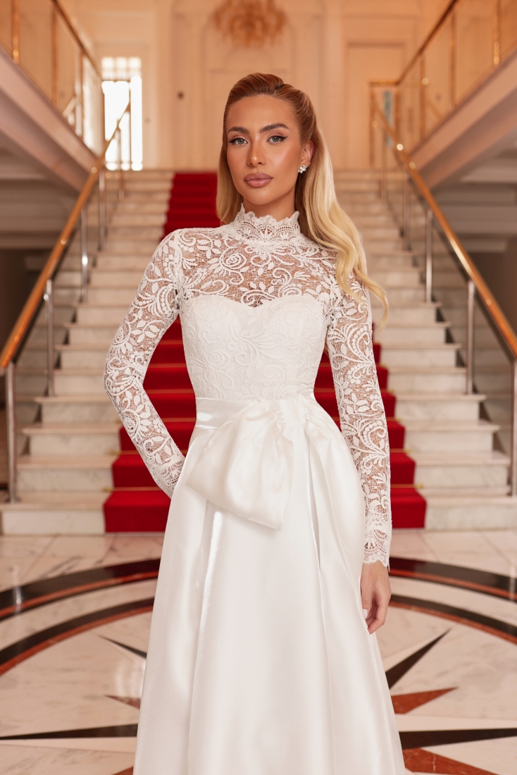 - Guippir com arabescos delicados que trazem textura e riqueza visual à peça. A saia em zibeline gloss confere leve brilho e volume na medida certa. O laço aplicado finaliza com romantismo e reforça a proposta atemporal da noiva moderna.
