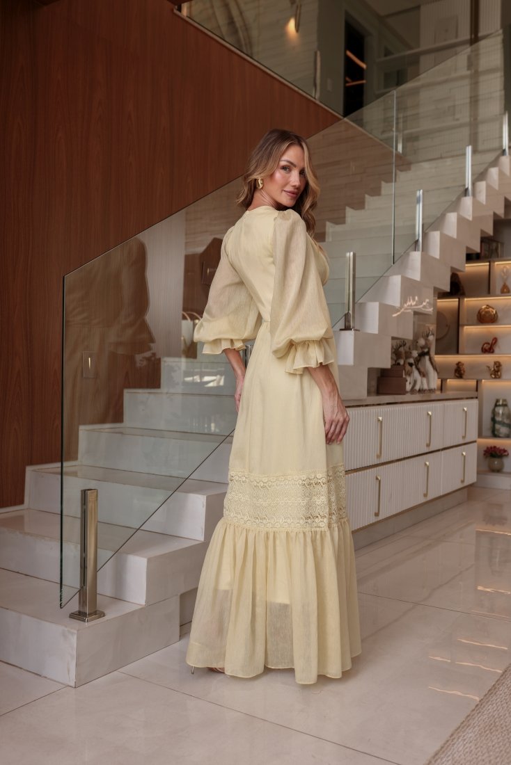 - O decote em V com acabamento em guippir valoriza o colo com sofisticação, enquanto o entremeio em maxi guippir na saia traz textura e profundidade ao visual;
