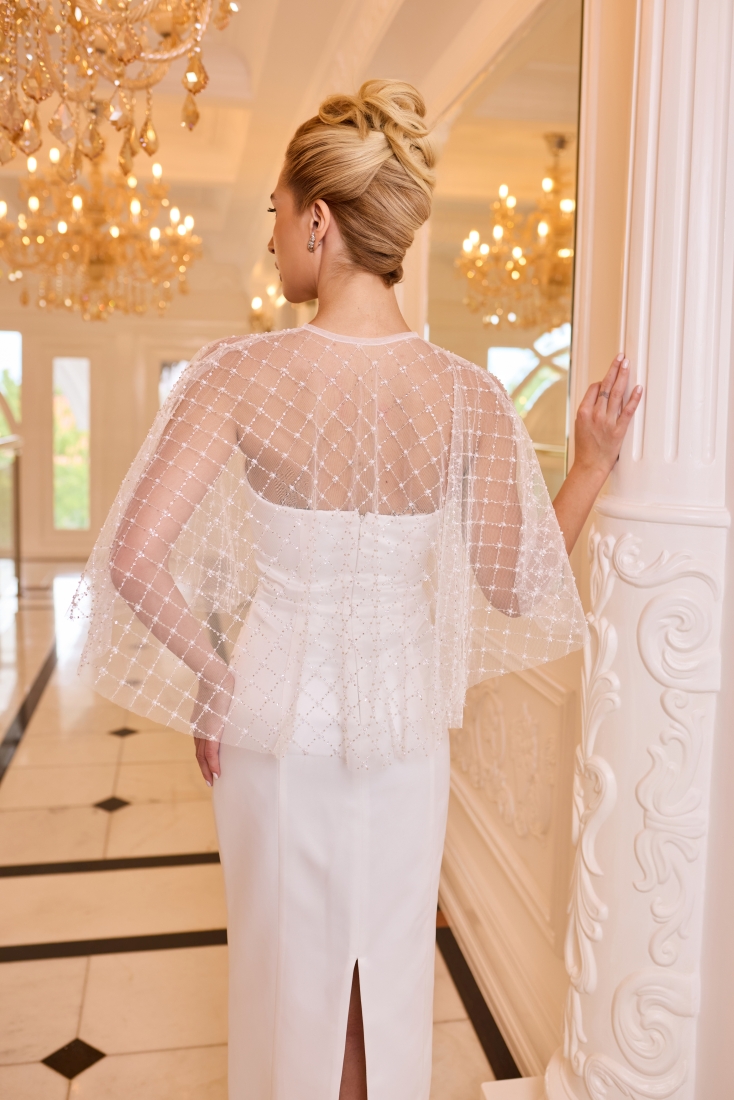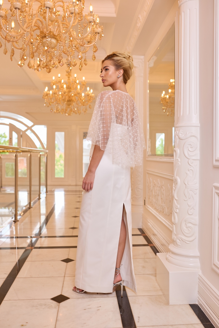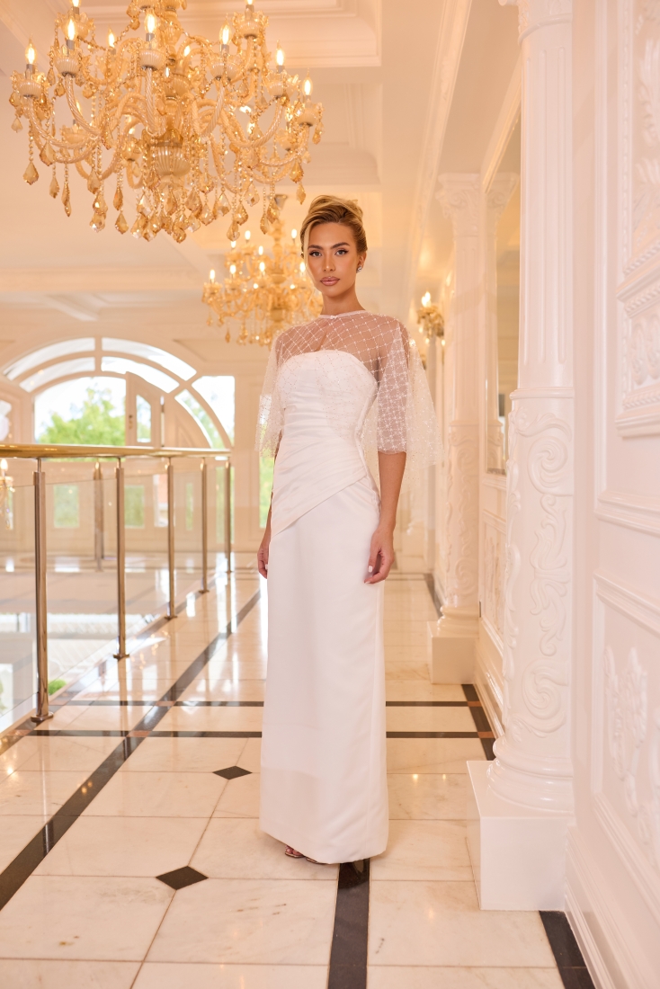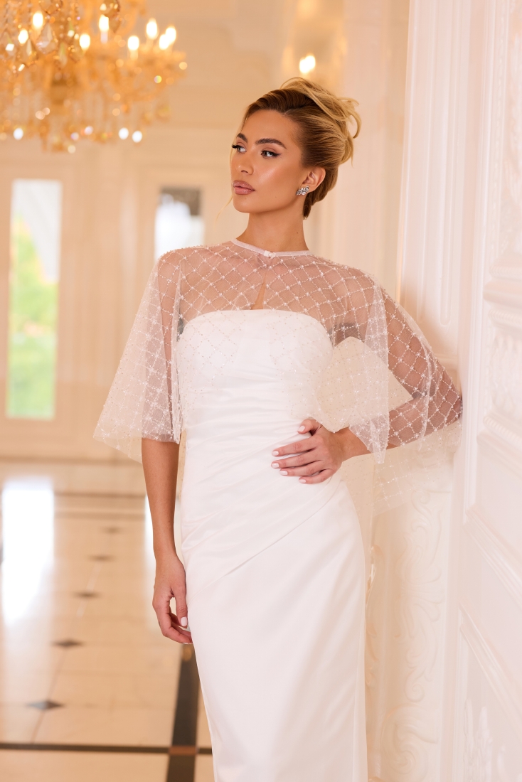 - Cetim com brilho sutil e caimento impecável. O drapeado estratégico no corpo cria elegância atemporal, enquanto a mantilha bordada com transparência delicada envolve os ombros com romantismo e presença refinada.