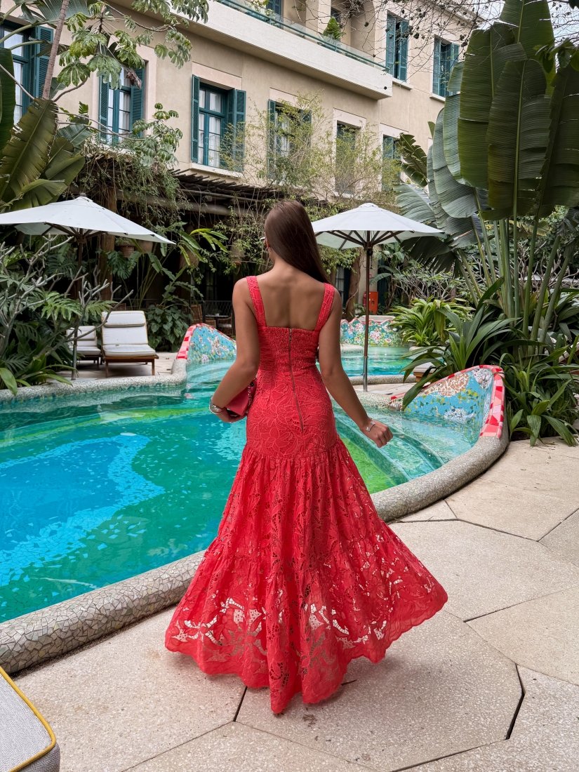 Confeccionado em Laise floral vermelha, conta com decote coração estruturado;
