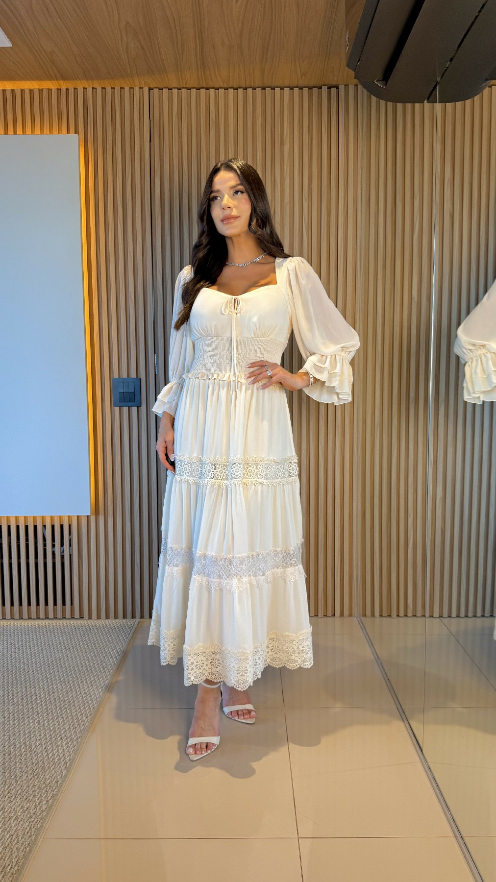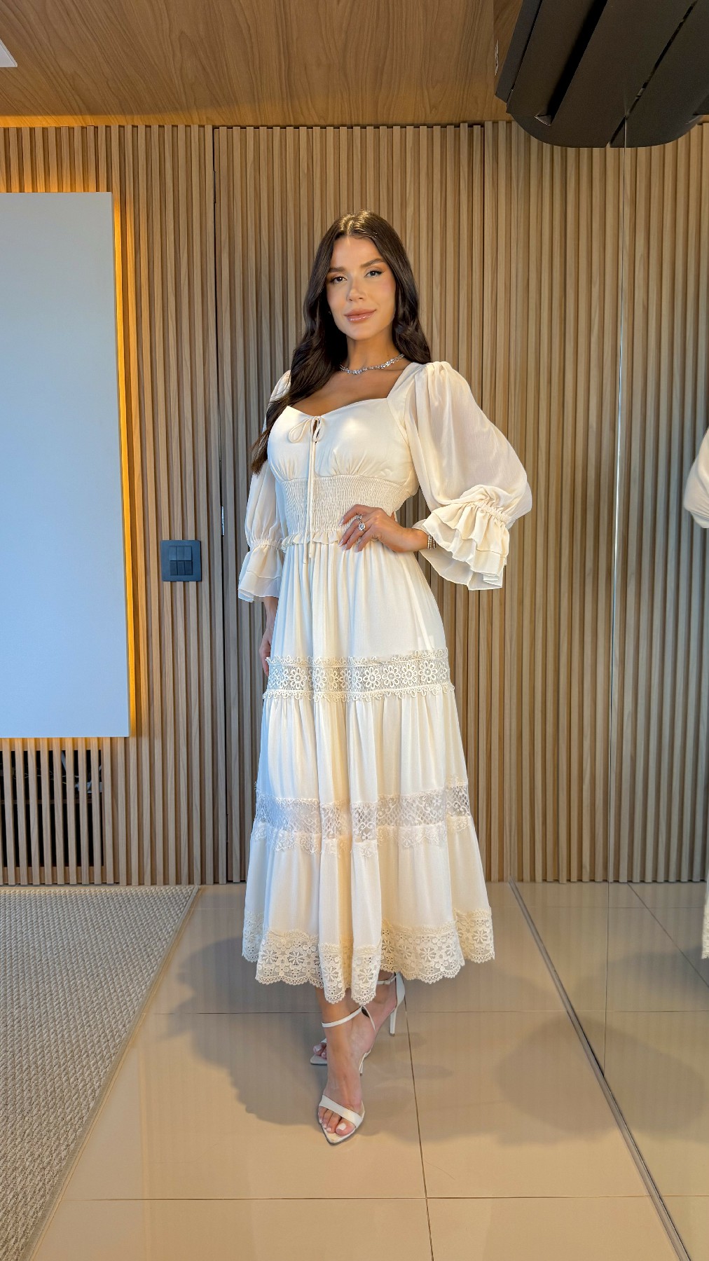 - Como usar: perfeito para momentos especiais, almoços e celebrações ao ar livre, o vestido Catarina combina com sandálias de salto delicadas ou rasteiras elegantes, criando um look leve e refinado;