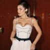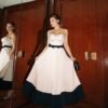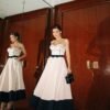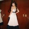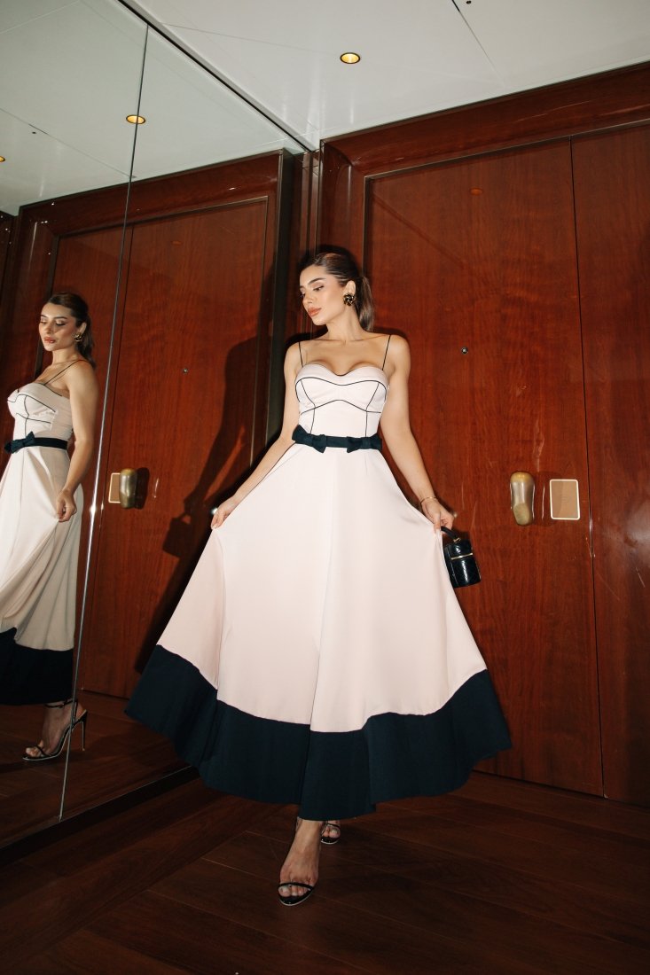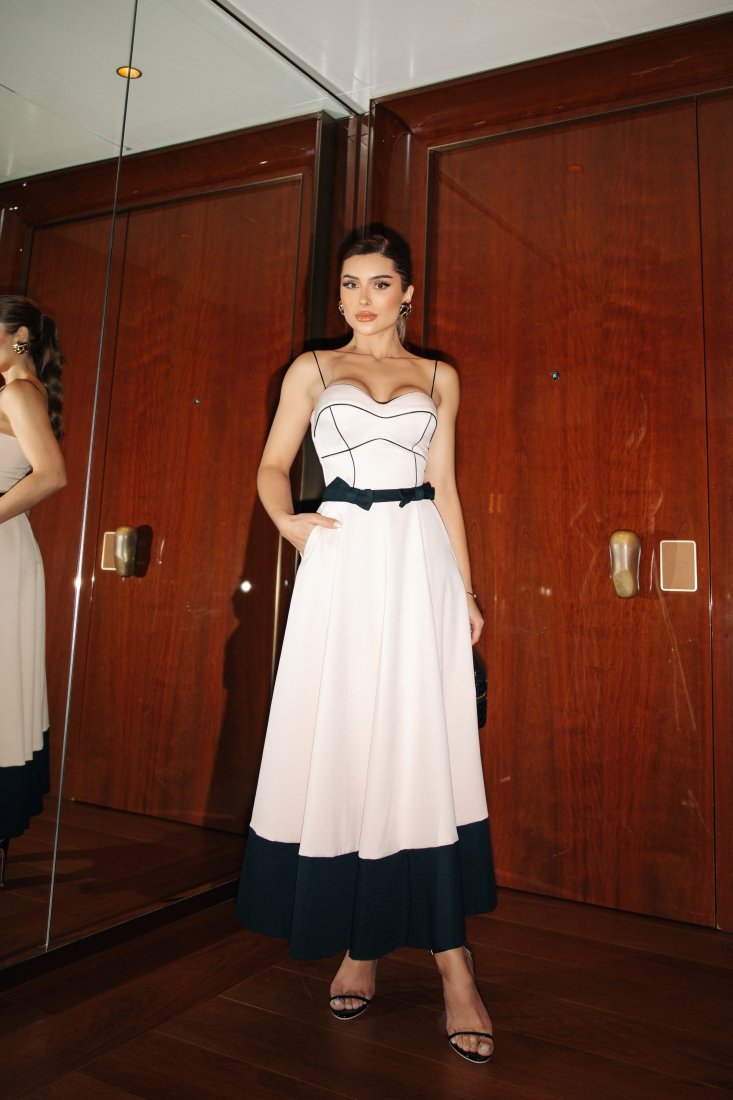 - O vestido Bianca traz busto estruturado estilo corset, alças finas e saia midi ampla com barra em contraste preto;