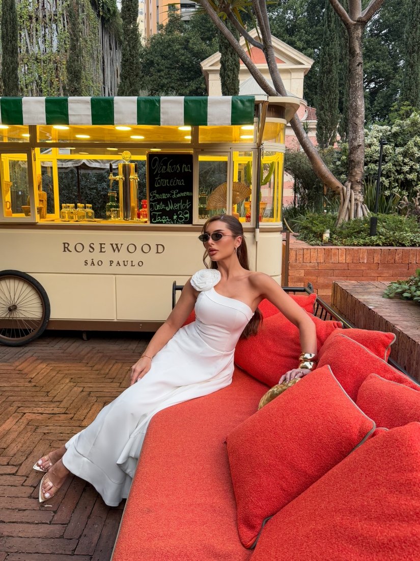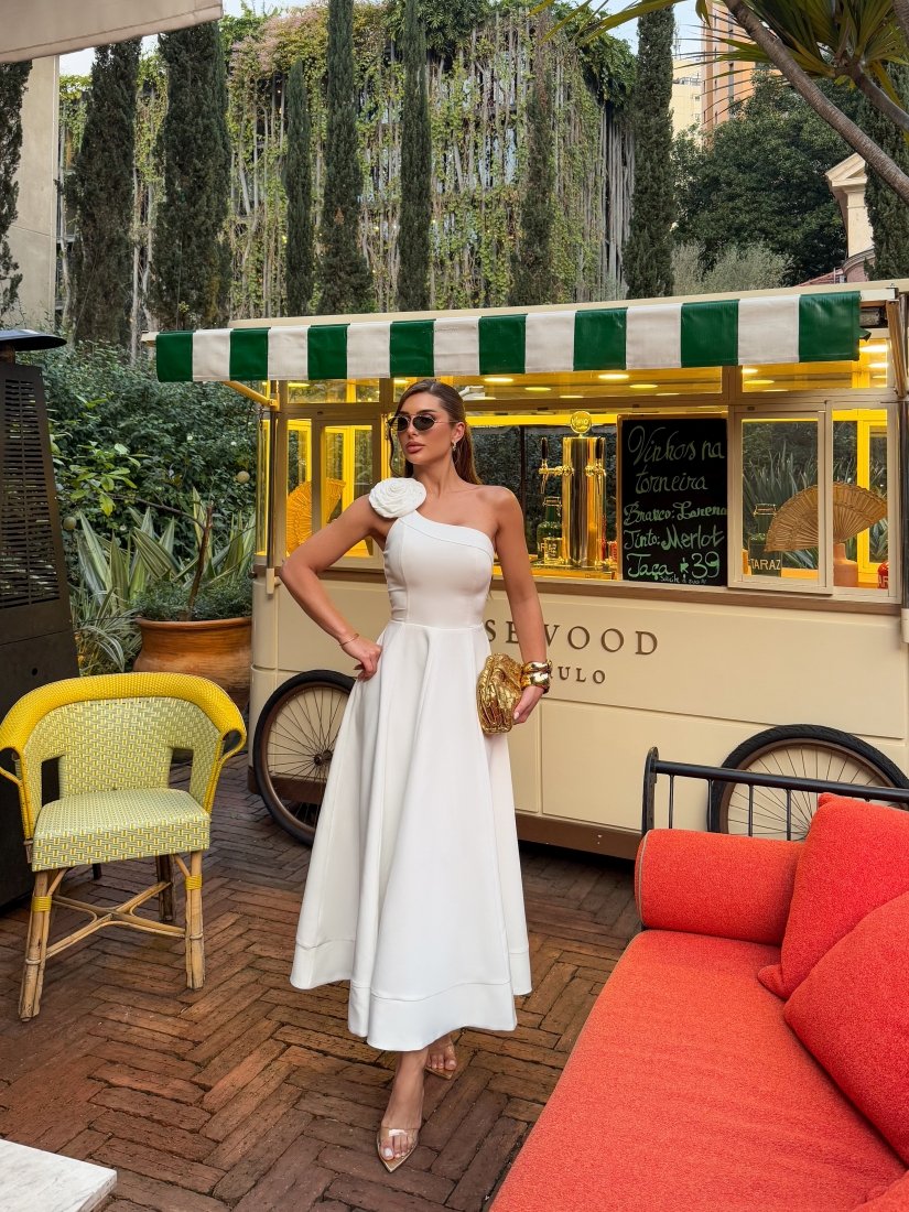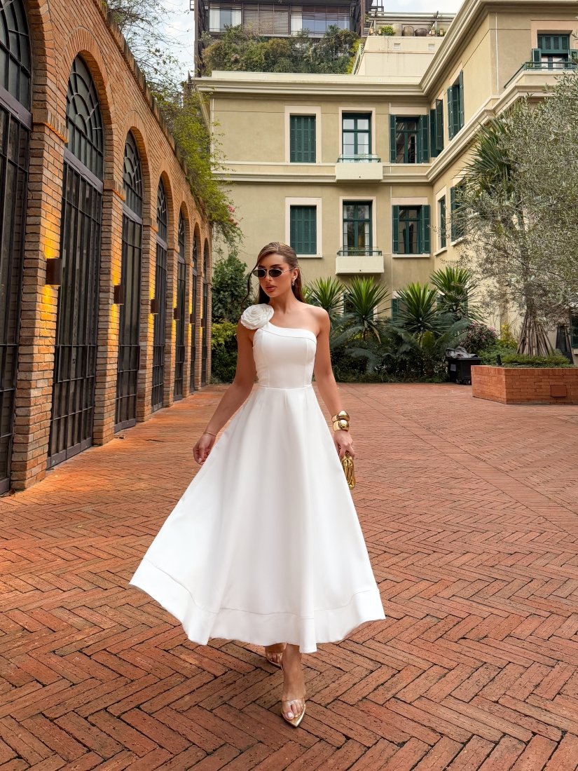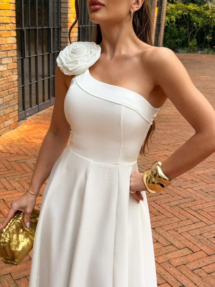 Possui decote assimétrico de um ombro só com aplicação de flor maxi em tecido no ombro, detalhe que confere romantismo e impacto visual;
