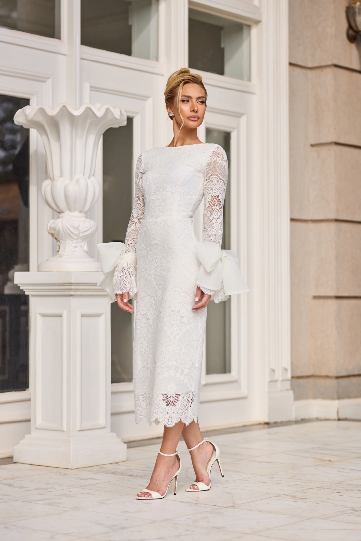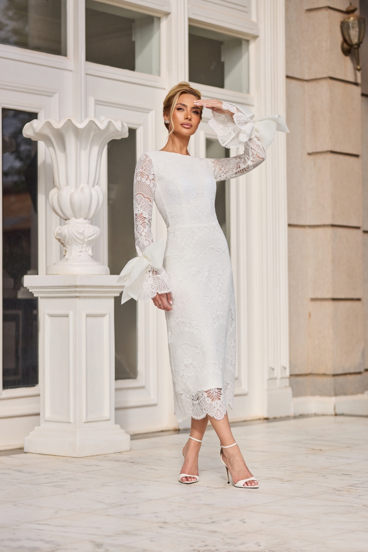 - Dicas: Ideal para casamento civil, cerimônia intimista ou celebrações diurnas. Combine com sandália delicada e acessórios minimalistas para manter o protagonismo nos laços. Para uma proposta mais marcante, aposte em cabelo preso e brincos discretos, valorizando as mangas.