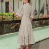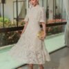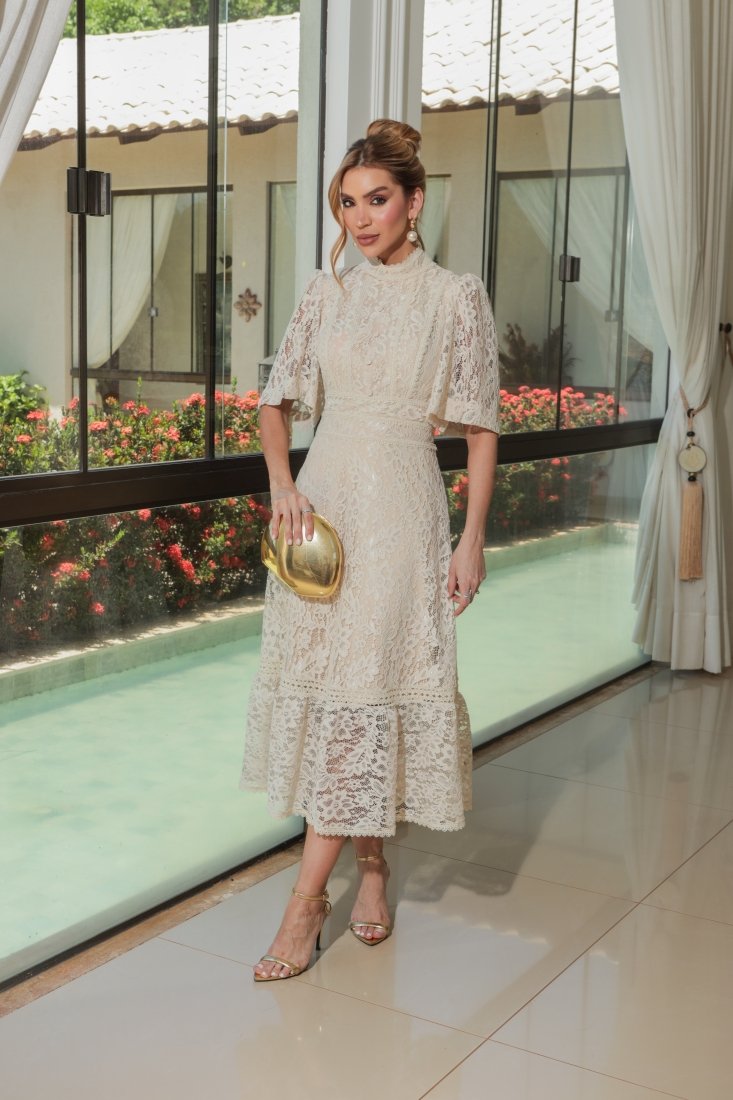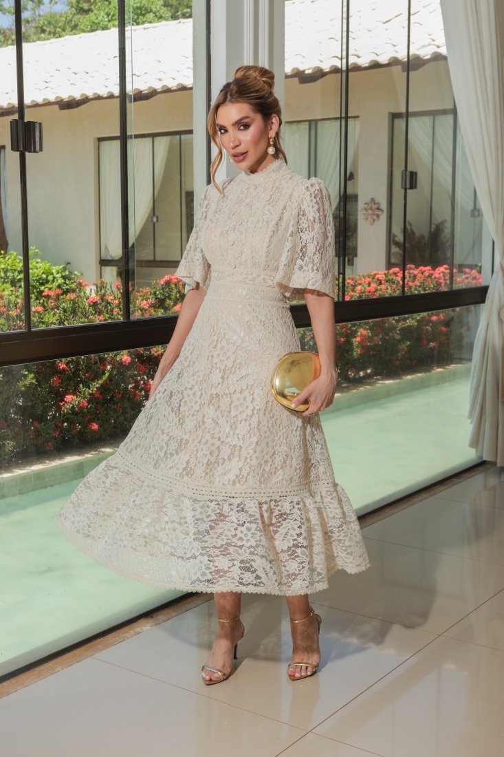 - Características: confeccionado em renda com guippir, o vestido Eveline traz o equilíbrio perfeito entre o romântico e o sofisticado. Com modelagem midi e cintura marcada, proporciona um caimento impecável e elegante.