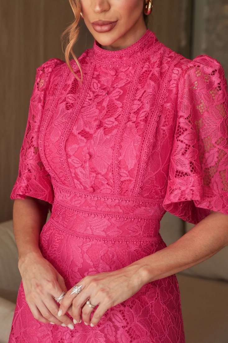 - Características: confeccionado em renda com guippir, o vestido Eveline traz o equilíbrio perfeito entre o romântico e o sofisticado. Com modelagem midi e cintura marcada, proporciona um caimento impecável e elegante.