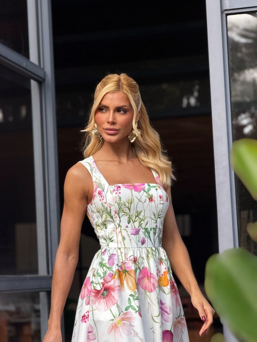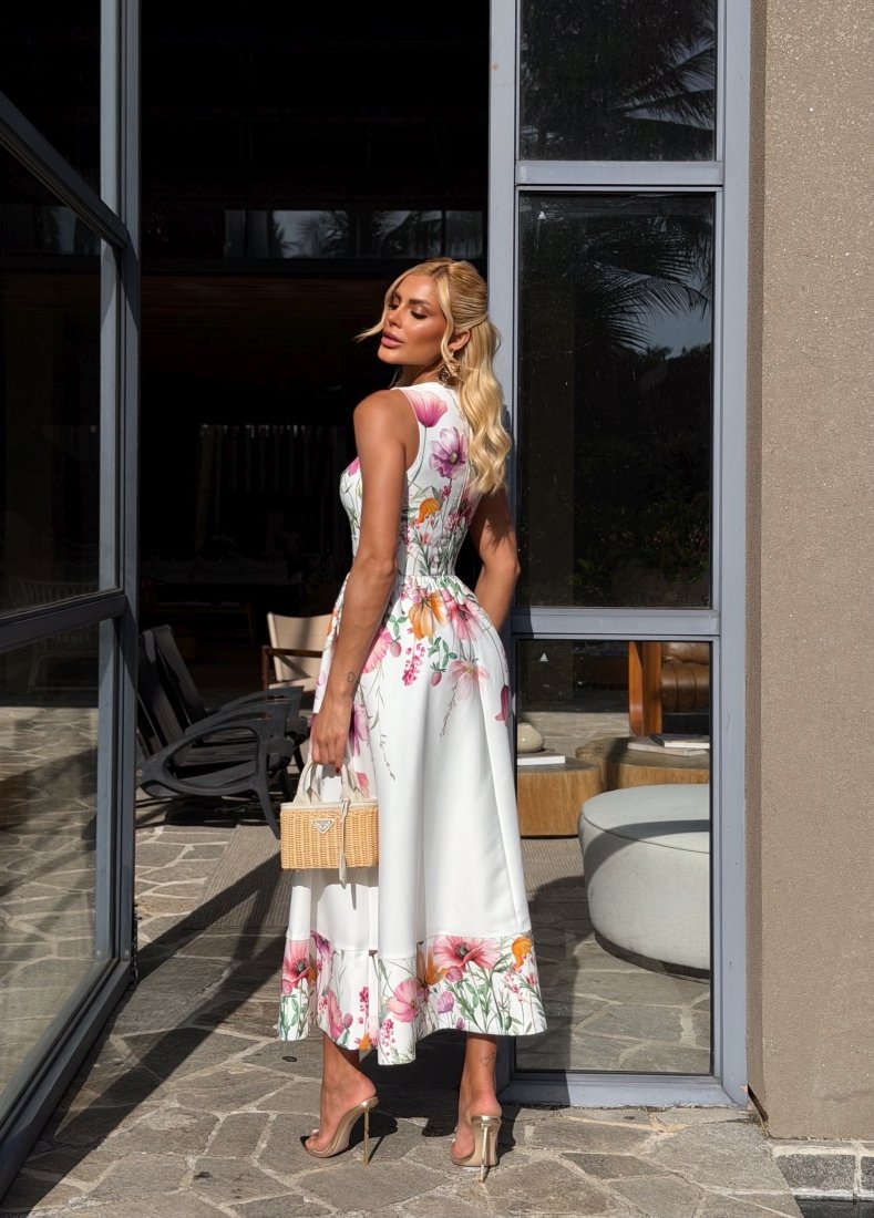 - Tecido em Crepe Floral com elastano - cor Off White com estampa exclusiva;