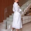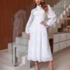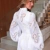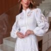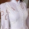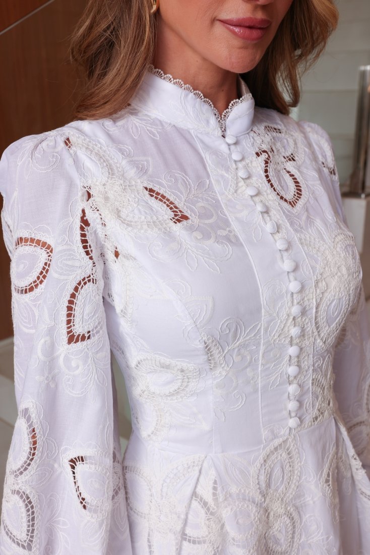 - Confeccionado em laise cor Off White, com bordados exclusivos, ele apresenta botões frontais cobertos na própria laise e gola alta em guippir, que adicionam um toque clássico e refinado. A saia maxi midi com pregas sutis garante movimento e sofisticação, enquanto o zíper invisível mantém o acabamento limpo e elegante;
