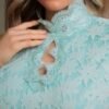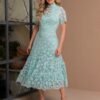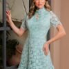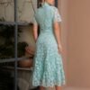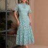 - Confeccionado em renda floral em veludo, modelo midi com mangas curtas, gola alta com recorte vazado e saia com camadas suaves que garantem movimento elegante;