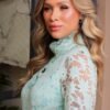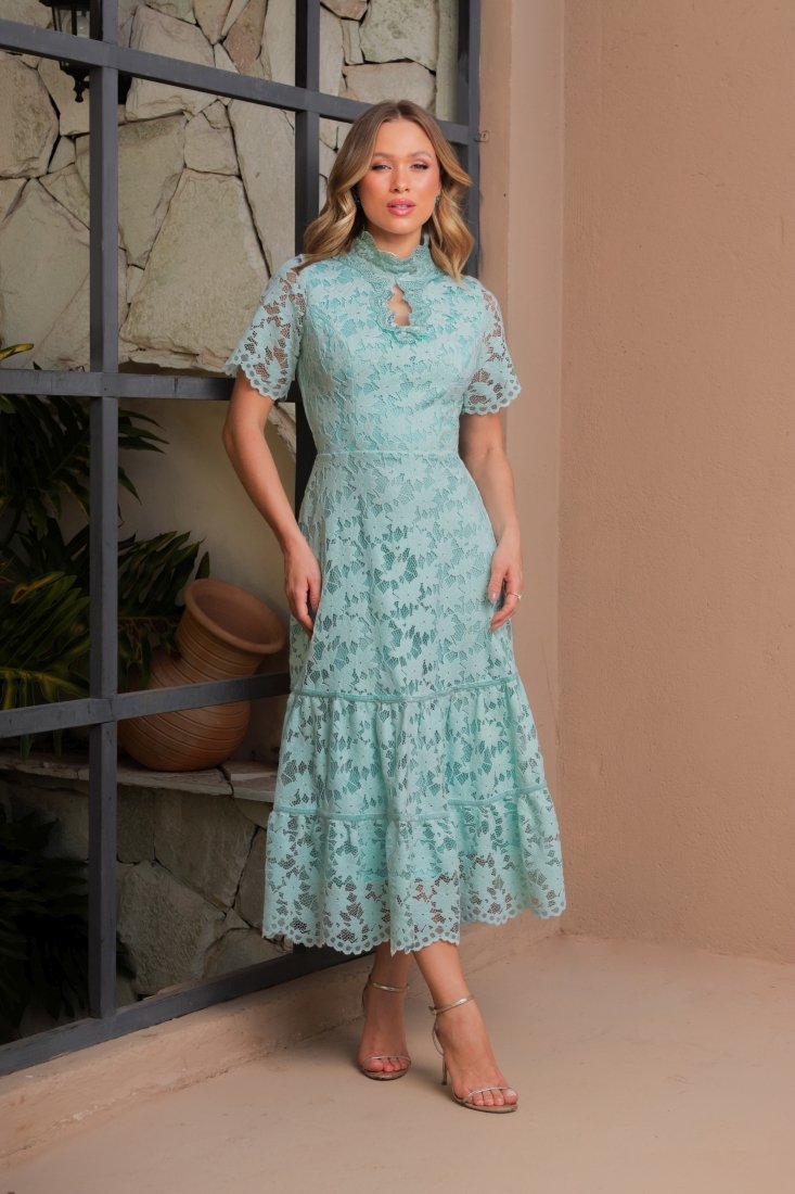 - Vestido em renda que traduz romantismo e sofisticação, destacando a feminilidade com delicadeza atemporal;