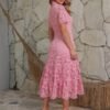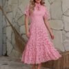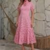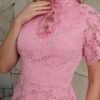 - Confeccionado em renda floral em veludo, modelo midi com mangas curtas, gola alta com recorte vazado e saia com camadas suaves que garantem movimento elegante;
