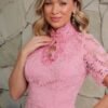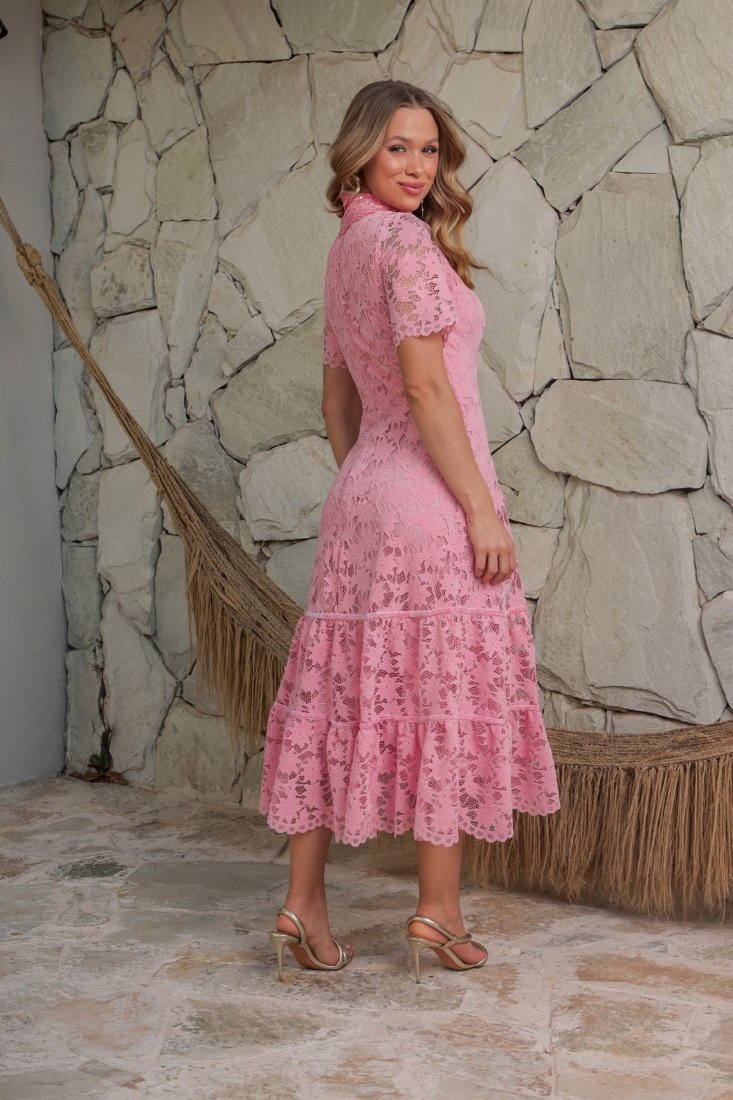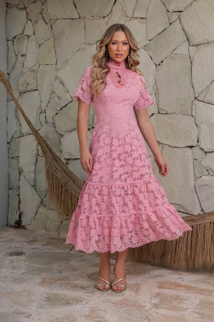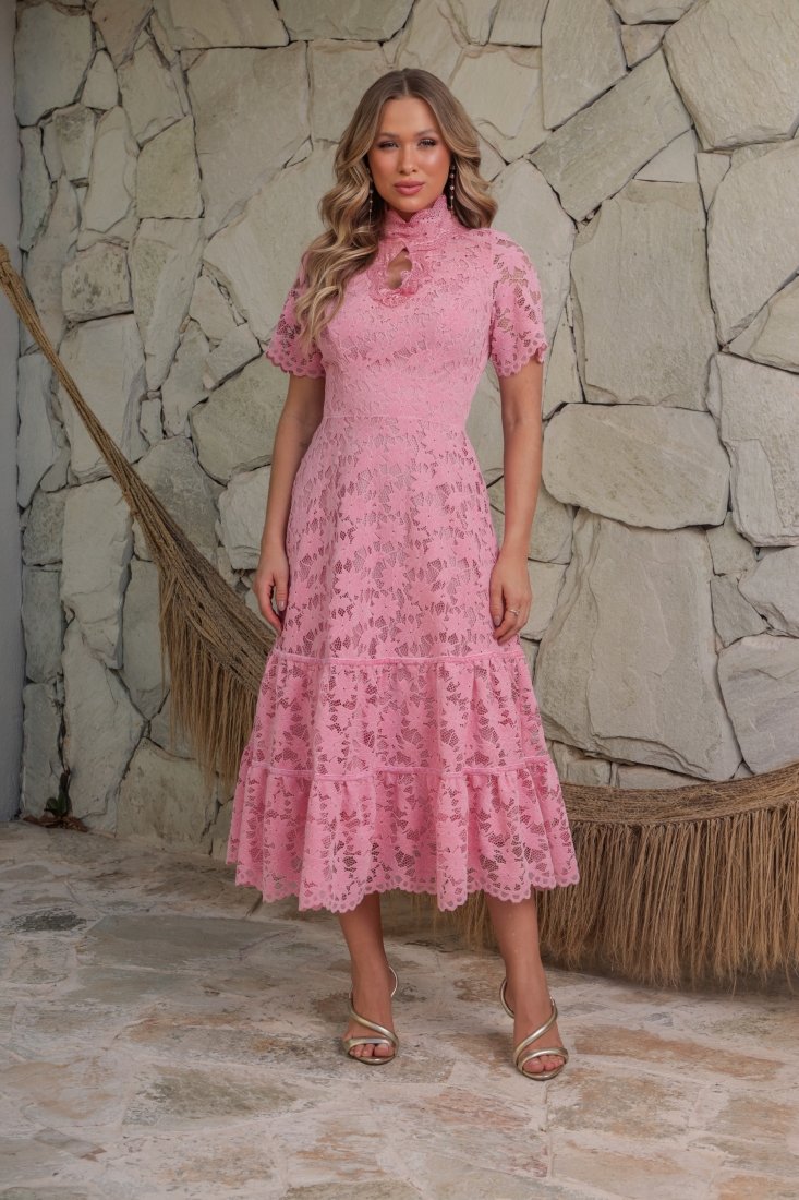 - Vestido em renda que traduz romantismo e sofisticação, destacando a feminilidade com delicadeza atemporal;