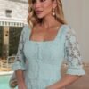 - Detalhes: o decote quadrado acrescenta um toque clássico, enquanto as mangas 3/4 com babado trazem leveza e romantismo. Com uma lapela simulando bolsos trazendo riqueza nos detalhes, e conta com recortes na saia trazendo movimento para a peça. O acabamento rendado confere textura, realçando o brilho natural do tecido;