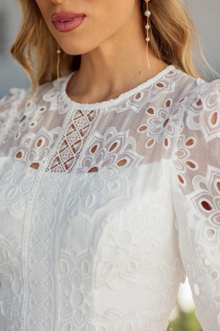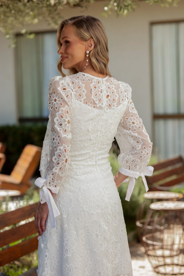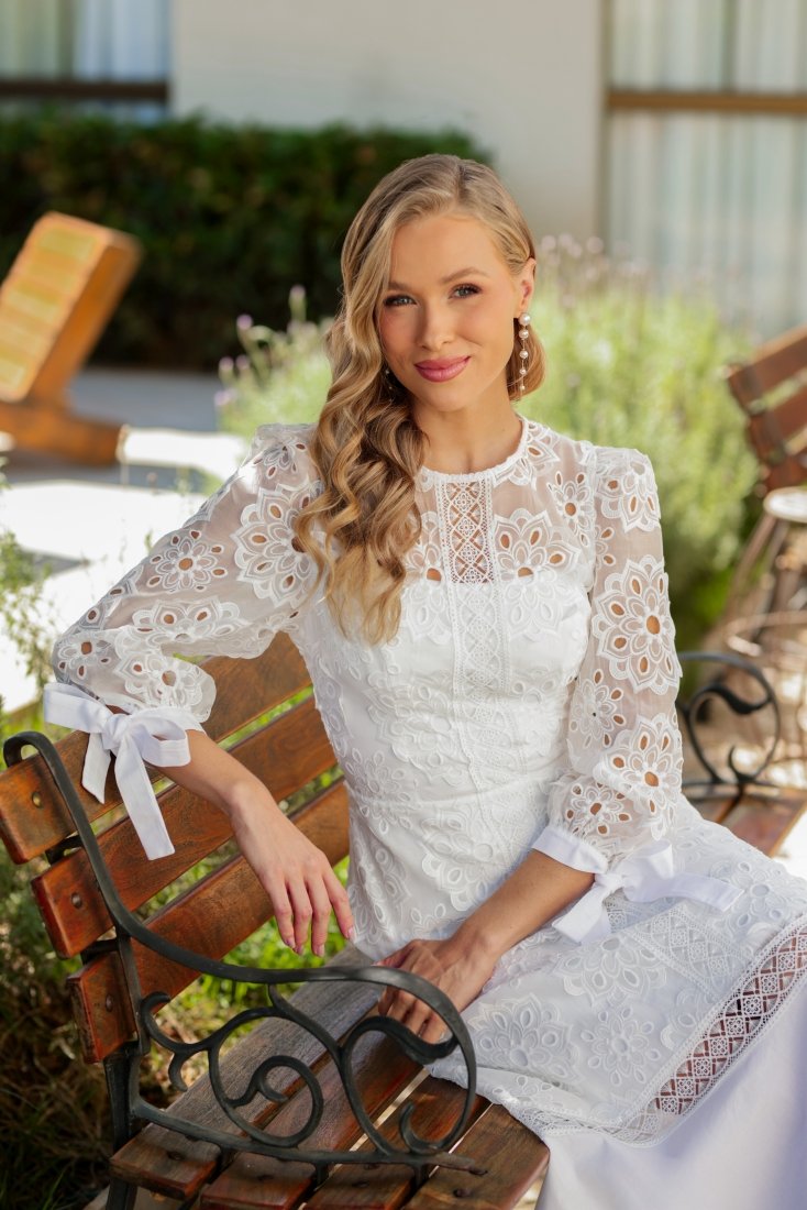 - Os recortes e aplicações em guippir trazem acabamento refinado e um toque romântico, equilibrando a proposta com sofisticação;