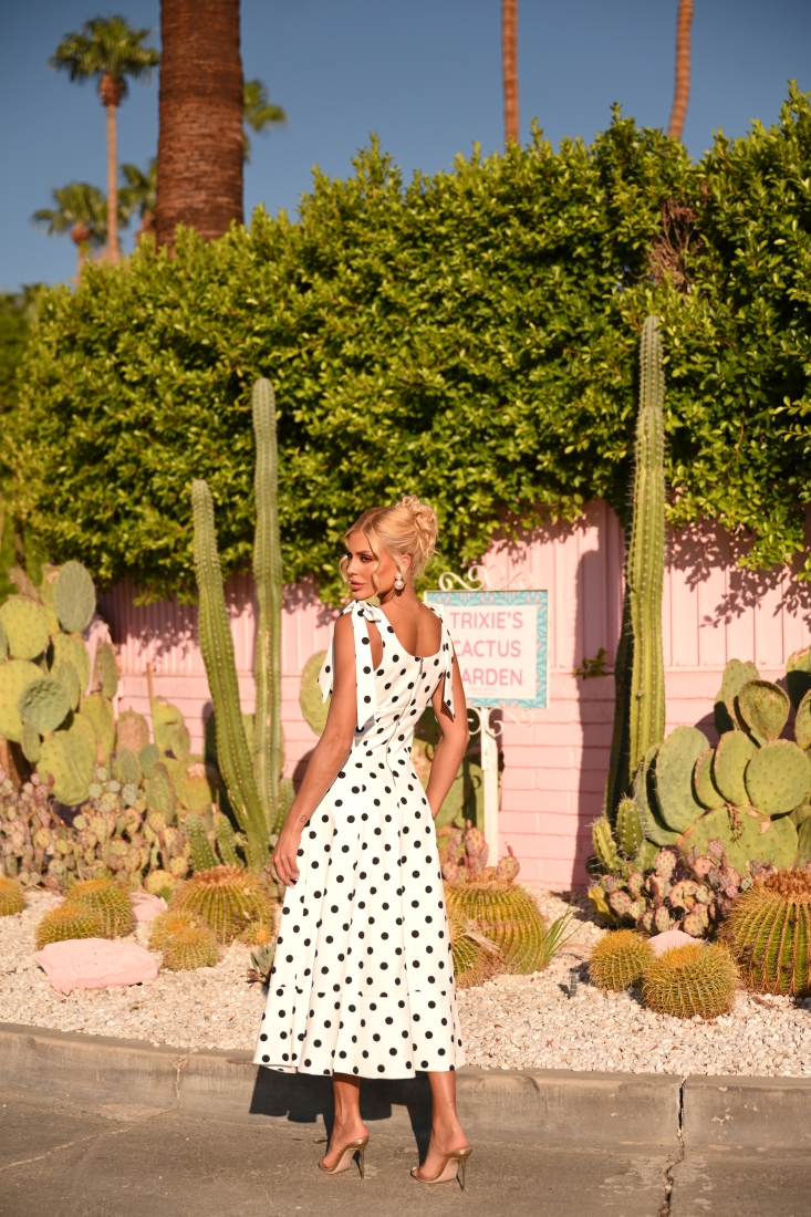 - Estampa clássica de poás preto e fundo off white;