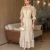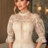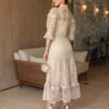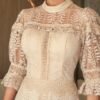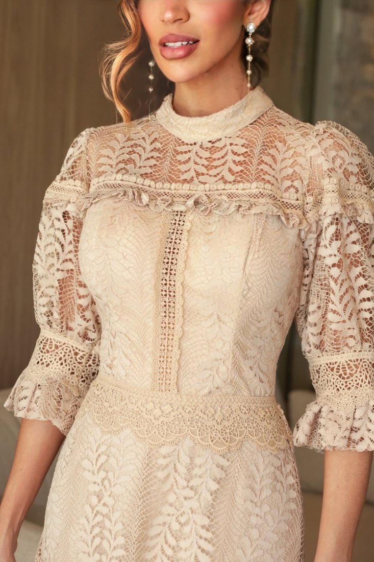 - Detalhes: apresenta gola alta rendada e mangas 3/4 com leve volume e acabamento em maxi guippir, além de recortes em guippir que destacam o trabalho artesanal do tecido. A saia com babados e pregas sutis confere movimento e leveza ao visual;