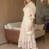 - Características: o vestido midi Tereza é confeccionado em renda com guippir, unindo delicadeza e elegância em uma peça de caimento fluido e romântico. A modelagem acinturada valoriza a silhueta com sofisticação;
